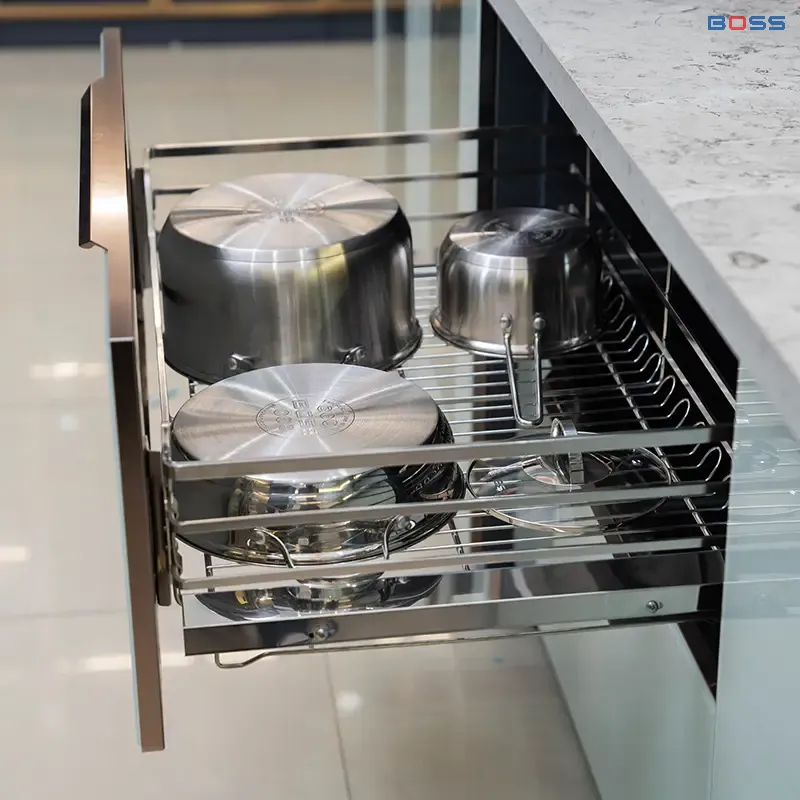 Ray trượt âm giảm chấn là một tính năng cao cấp mà sản phẩm Giá Xoong Nồi Inox 304 sở hữu. Hệ thống ray trượt này giúp cho việc kéo ra, đẩy vào giá xoong nồi trở nên nhẹ nhàng, êm ái, không gây tiếng ồn khó chịu.